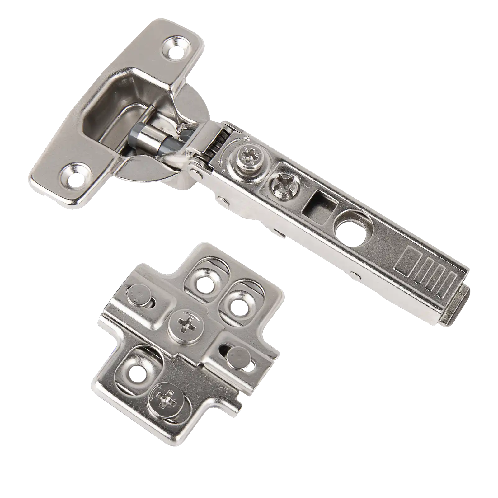 1. Prowadnik. Zawias składa się tak na prawdę z dwóch rozłączalnych elementów (rzadko sprzedawanych oddzielnie). Sam zawias montuje się w skrzydle drzwi, a na korpusie mebla montowany jest prowadnik. W ostatniej fazie składania mebli oba te elementy należy z sobą połączyć. Najprostsze, zatem i najtańsze zawiasy łączy się poprzez wsunięcie zawiasu na prowadnik, a następnie skręcenie ich ze sobą. Czynność bardzo irytująca i niepolecana osobom o niskim poziomie cierpliwości... Bardziej wyrafinowane zawiasy mają system łączenia z prowadnikiem w systemie klik-klik, czyli zatrzaskuje się je ze sobą. Ich rozłączanie w przypadku konieczności zdjęcia drzwiczek lub wymiany zawiasu również jest zdecydowanie prostsze. Wystarczy nacisnąć wbudowaną w zawias dźwignię lub przycisk. Ten system ma dodatkową przewagę związaną z regulacją, o czym w punkcie 2.