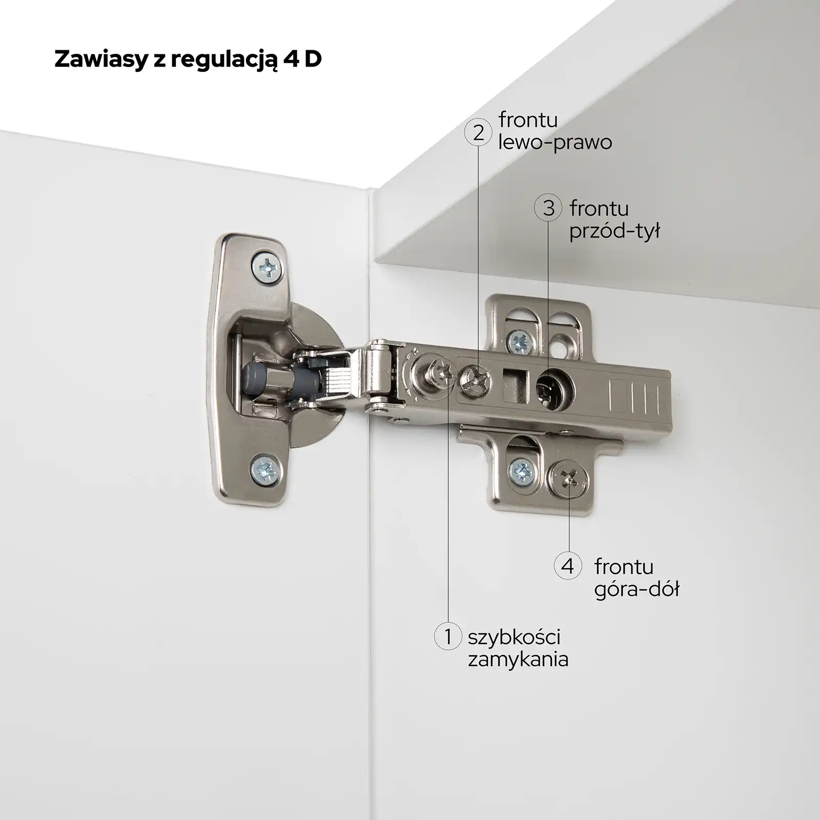 3. Tempo domyku. Warto zwrócić uwagę, czy zawias posiada system cichego domyku. Zawiasy pozbawione tego systemu, będą tańsze, ale podczas zamykania, drzwi będą uderzać o korpus mebla, generując nieprzyjemny hałas oraz z czasem niszcząc powierzchnię drzwi oraz krawędzie korpusu. Zawiasy z cichym domykiem posiadają mechanizm spowalniający zamykanie się drzwi. Zamkną się wolniej, ale cicho. Niestety i one mają swoje słabe strony. Drzwi duże i ciężkie będą zamykać się zbyt szybko, a te małe, wąskie i lekkie będą zamykać się zbyt wolno. Ponieważ każdy zawias ma swoją własną specyfikę, problem ten eliminuje się poprzez zamontowanie dwóch różnych zawiasów na dole i na górze drzwi. Zdecydowanie lepszym rozwiązaniem jest jednak zawias 4D. Ma on unikalną funkcjonalność. Posiada dodatkową śrubę regulacyjną do ustalania tempa domykania zawiasu. Rozwiązuje to nie tylko problem drzwi nietypowych (zbyt ciężkich lub zbyt lekkich), ale jest też wartością dodaną umożliwiającą dostosowanie tempa domykania wszystkich drzwi do indywidualnych preferencji użytkownika. Przykładem takiego zawiasu jest AZ514-D od polskiej firmy Shop Line.