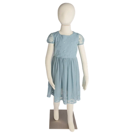 Pełnosylwetkowy manekin dziecięcy ekspozycyjny z elastycznego tworzywa sztucznego obleczonego materiałem lycra w kolorze ECRU. Wysokiej jakości włoski produkt. Ze względu na swoją specyfikę materiałową umożliwia kształtowanie, wyginanie i układanie zarówno nóg, jak i rąk w oczekiwaną pozycję. Manekin odzwierciedla sylwetkę dziecka w wieku 8 lat. Wysokość 120cm. W zestawie znajdują się dwie podstawy, jedna stalowa w kolorze INOX, druga drewniana w odcieniu klonu. W zestawie również dwie zagłuszki, metalowa i drewniana, odpowiadająca podstawom. Można je wykorzystać w przypadku chęci demontażu głowy. Ostatnia cena katalogowa wynosiła 399PLN, wyprzedaż w zdecydowanie atrakcyjniejszej cenie.